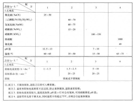 在鍍銅錫合金過(guò)程出現(xiàn)的不合格鍍層,退除方法見(jiàn)表4-1-7。