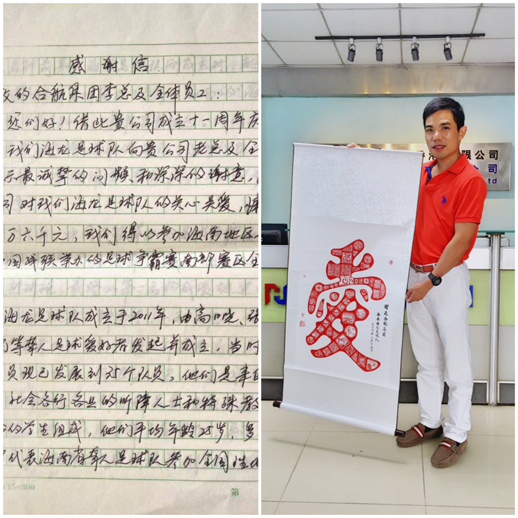 合航集團愛心基金會自成立以來,一直秉持著關愛員工回饋社會的理念,為幫助這群可愛的孩子筑夢,合航集團于2015年十周年慶典上向海南省海龍足球隊捐贈人民幣五萬元整,并于2016年開始正式撥款資助球隊比賽。海龍足球隊為感謝合航集團的關愛,特意為我司李董寄來了親筆感謝信及紀念品,讓愛散播在每個角落是我們共同努力的目標。