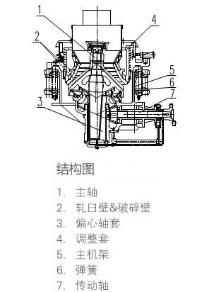 在圓錐破碎機的工作過程中,電動機通過傳動裝置帶動偏心套旋轉,動錐在偏心軸套的迫動下做旋轉擺動,動錐靠近靜錐的區段即成為破碎腔,物料受到動錐和靜錐的多次擠壓和撞擊而破碎。動錐離開該區段時,該處已破碎至要求粒度的物料在自身重力作用下下落,從錐底排出。