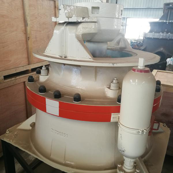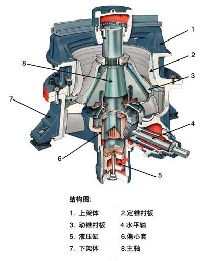 電機帶動破碎機的小齒輪,小齒輪帶動大齒輪,大齒輪組件(大齒輪、大齒輪架、偏心鋼套)帶動偏心套組件(偏心缸套、偏心銅套)和主軸組件(主軸、內錐、內錐襯板)以理論垂直線為中心,在銅襯套內公轉,主軸組件在偏心銅套內以主軸的中心線可以實現自轉??諜C運行的時候,偏心套組件“抱著”主軸組件和隨大齒輪一同公轉,當物料加入到破碎腔后,主軸總成(主軸、內錐)在物料的阻力下在偏心銅套內緩慢的自轉。內錐的運行軌跡看起來是在破碎腔內來回擺動,同時緩慢的旋轉。物料被擺動的內錐擠壓破碎。支撐套與架體連接處靠液壓缸壓緊,當破碎機內落入金屬塊等不可破碎物體時,單缸的動錐由底部液壓活塞托起,起到排放口調整和過鐵保護、反復起落排除堵礦的作用。